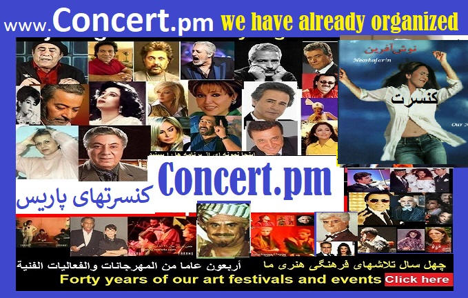 Organizing a world tour for top artists such as : Akbar Golpa, Behrouz Vossoughi, Homeira, Daryoush, Ebi, Shohre, Leila Forouhar, Wigen, Sousan, Shakila, Farhad, Sattar, Aref, Shammai Zadeh,Parviz Sayyad, Hadi Khorsandi, Mahasti, Souzan Rovshan, Sheida, Bahaneh, MehrVarzan, Shahram ShabPareh, Faramarz Assef, Bijan Mortazavi, Ghassem Goli, Noush Afarin, Esfandiyar Monfared zadeh, Houman Azar Kolah, Mansour, shohreh Aghdashlou, Moein, Marshall Manesh, Fattaneh, Azar Shiva &... |